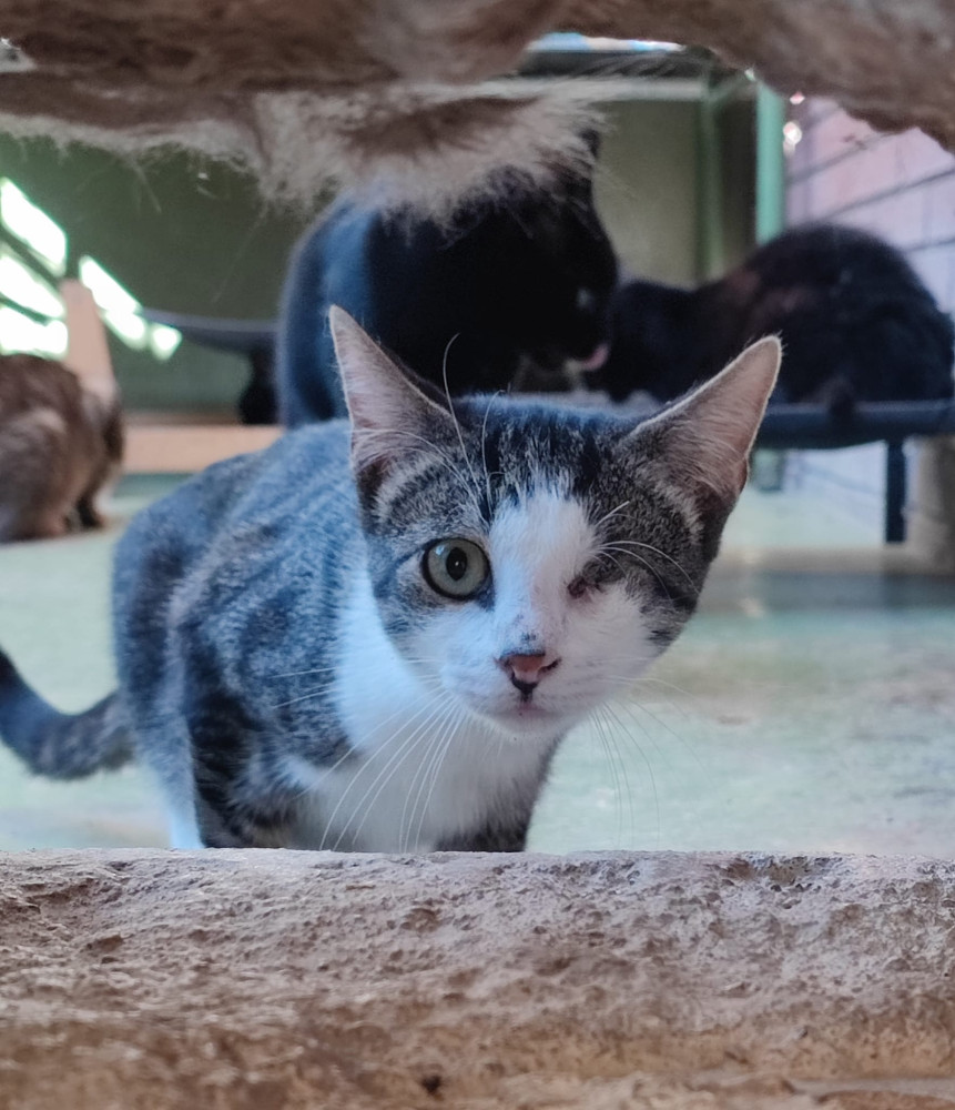 Edam llegó muy resfriado junto a sus hermanos Cheddar y Saltirona. Eran muy miedosos y no se dejaban curar como tocaba. La infección avanzó tanto que al final perdió un ojito y tuvimos que quitárselo. Ahora es un precioso tuertito que nos mira con su cara simpática, poco a poco el miedo dio paso a la curiosidad y fue descubriendo que las caricias no están tan mal!