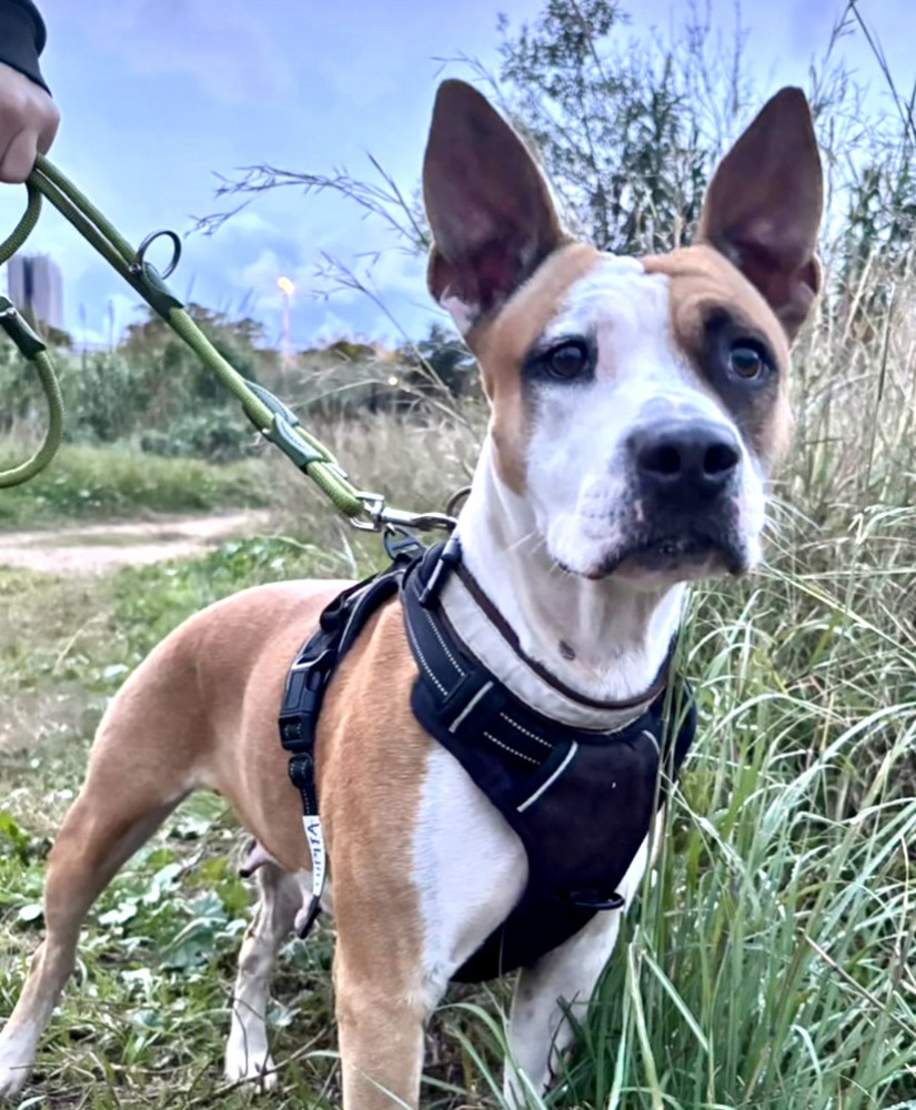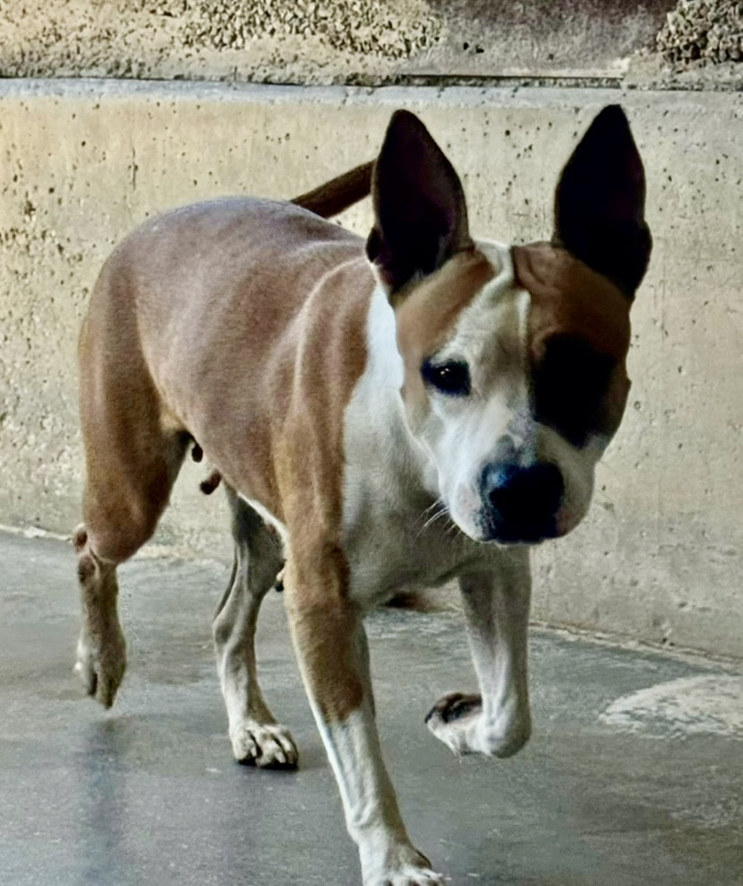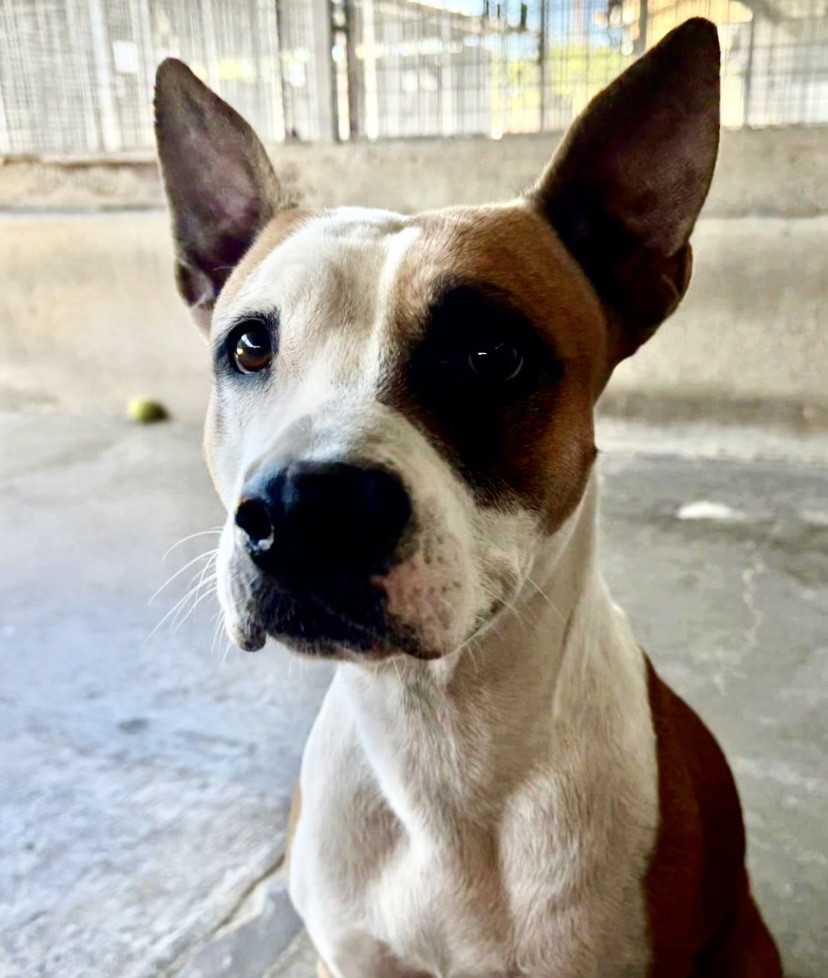 Os presentamos a Lupita, una perrita preciosa de aproximadamente un año y medio, de color blanco y marrón, con una mirada que conmueve a cualquiera. Fue encontrada en la T-11, a la altura del CAP de La Granja, asustada y desorientada. Muestra signos de haber estado amamantando, lo que hace pensar que recientemente ha sido mamá.